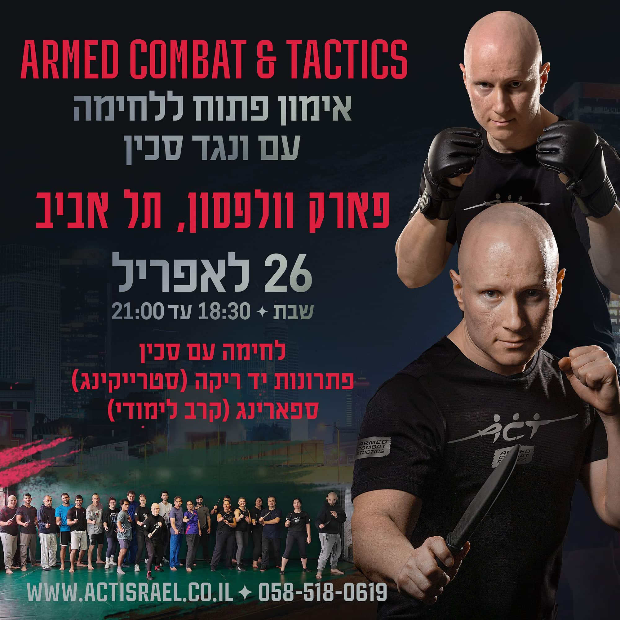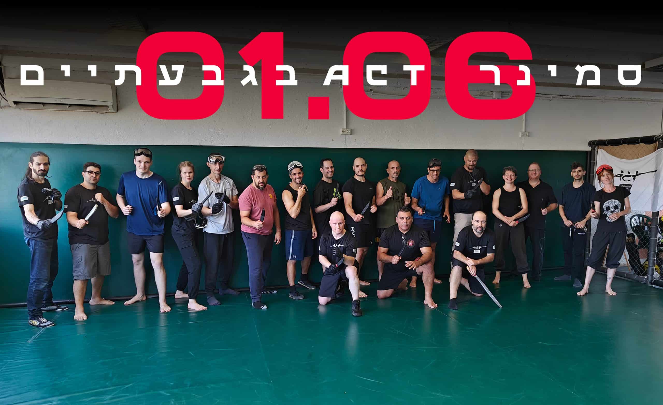 אודות השיטה: שיטת Armed Combat & Tactics נוסדה בישראל ע”י אלכסנדר ז’לזניאק ונח גרוס, ונלמדת כיום ב-80 קבוצות ב-25 מדינות. ב-ACT מלמדים לחימה בכלי נשק בעלי להב, וגם אלות, מקלות ודומיהם, לצד לחימה ביד ריקה, המבוססת על ניסיון בקרבות עם ונגד נשק ומותאמת במיוחד להגנה מול סכין.